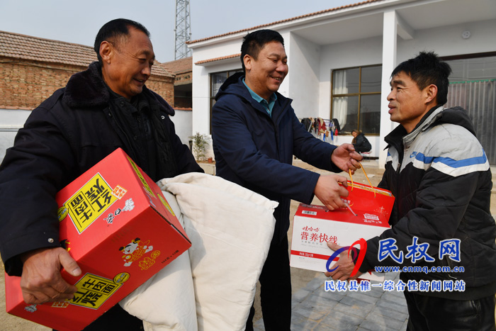 1月8日,民权县公安局驻双塔镇常东村第一书记王玉森到常东村慰问贫困户,给贫困户送去棉被、火腿肠、营养快线、方便面等慰问品,把党和政府的温暖送到贫困户的心坎上。