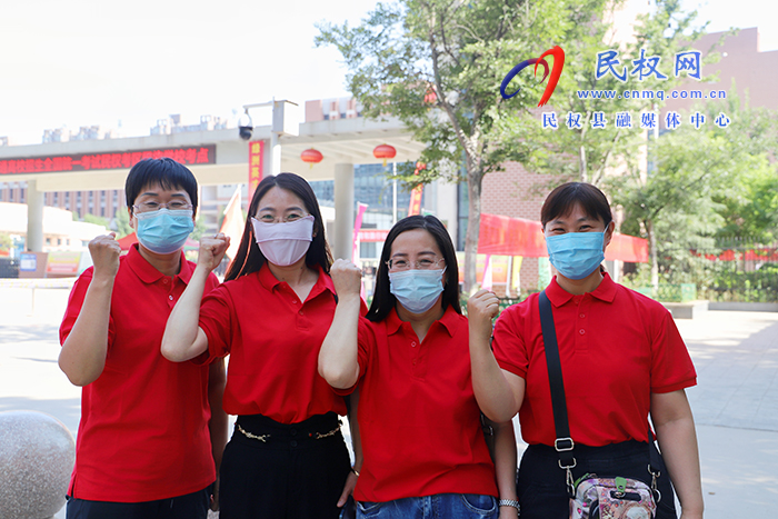 为了给学生们加油鼓劲,民权县高级中学的送考老师们都穿上了中国红衣服,为自己的学生送考。祝愿他们旗开得胜、超常发挥,都能考出自己理想的成绩。